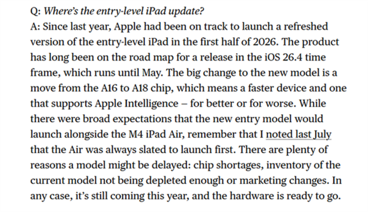 本年3月,苹果在官网上鸠集发布了多款新品,涵盖了iPhone、iPad、Mac、高慢器和耳机等多个品类。但是,备受外界保重的初学级新平板——iPad12却未能按时亮相。著名苹果爆料东谈主马克·古尔曼表露,苹果仍缱绻在本年上半年推出iPad12,并展望与iOS26.4同步发布,发布时间可能会不息至5月。