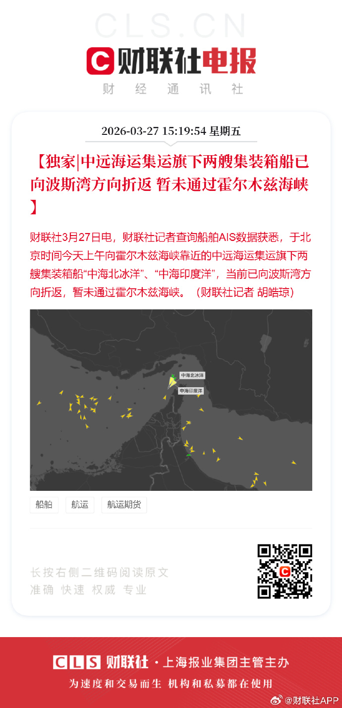 据财联社3月27日音书,记者查询船舶AIS数据获悉,于北京期间今天上昼向霍尔木兹海峡围聚的中远海运集运旗下两艘集装箱船“中海北冰洋”“中海印度洋”,波音体育官方网站现时已向波斯湾场地折返,暂未通过霍尔木兹海峡。