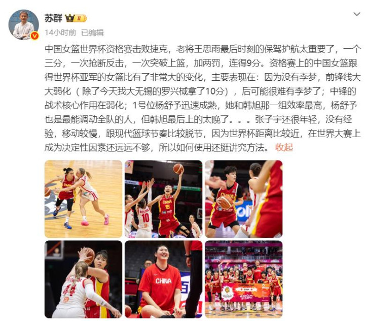 在中国女篮告成晋级的第一时刻,身为有名中国篮球褒贬员和《篮球前锋》总裁剪的苏群先生,就阐发出了对中国女篮异日的深远担忧,而他的担忧竟也十分的点石成金。