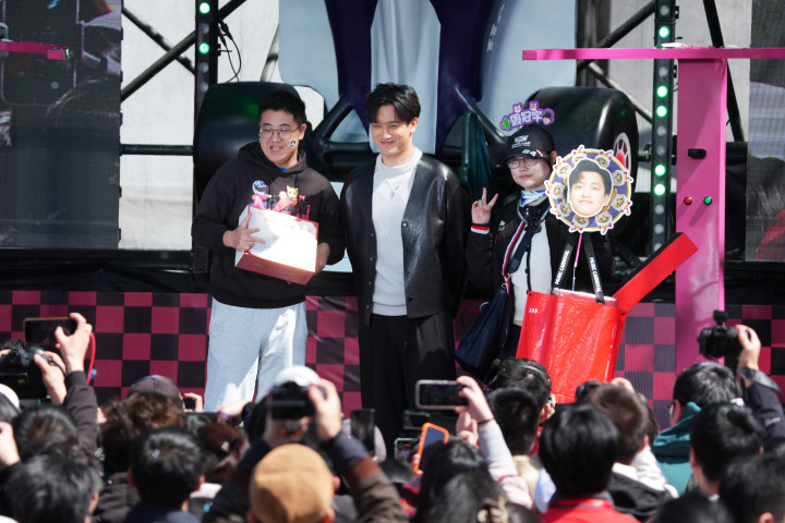 F1中国大奖赛前夜,周冠宇(中)代表凯迪拉克车队与车迷互动东方IC