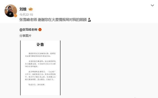 搜狐文娱讯 3月24日,歌手刘维发文担心张雪峰,他写说念:“张雪峰淳厚,谢谢您在火星谍报局对我的和蔼。”