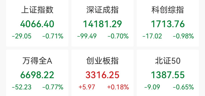 放置午盘,上证指数跌0.71%,报4066.40点;深证成指跌0.70%,报14181.29点;创业板指涨0.18%,报3316.25点。