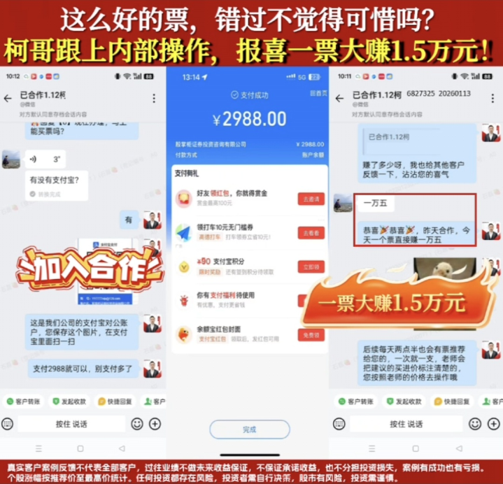 为了增强劝服力、诱骗投资者付费,客服束缚用盈利案例进行宣传:“不需要您作念弃取,抄功课就好,我们许多客户一两只票就赚回行状费了。有的融合学员跟上操作不到半个月,就赚了5个涨停板。”客服还例如诠释盈利逻辑:“比如说给您一只票,成本价是10块钱,等涨到11块钱,中间就有1块钱一股的差价,这个时候我们就会指示您卖出得益。”