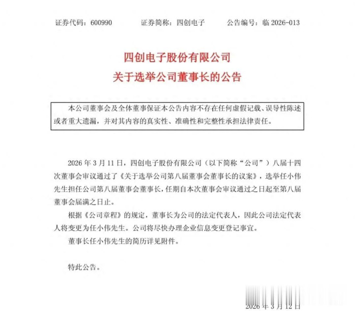 3月11日,四创电子股份有限公司(以下简称“公司”)八届十四次董事会审议通过了《对于选举公司第八届董事会董事长的议案》,选举任小伟担任公司第八届董事会董事长,任期自本次董事会审议通过之日起至第八届董事会届满之日止。