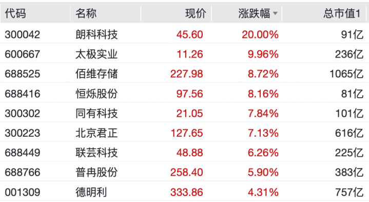 朗科科技录得20cm涨停,太极实业10cm涨停,佰维存储涨近9%,兆易改换涨超4%,江波龙涨近4%,德明利、北京君正、恒烁股份纷繁高潮。