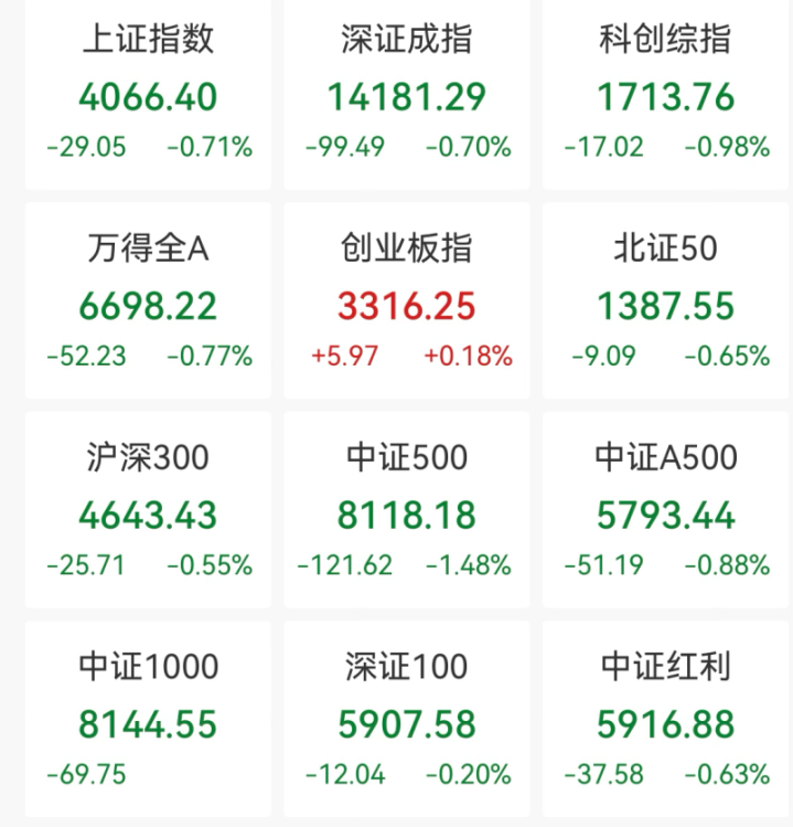 戒指午间收盘,沪指报4066.4点,跌0.71%;深证成指跌0.7%,创业板指涨0.18%,科创综指跌0.98%。