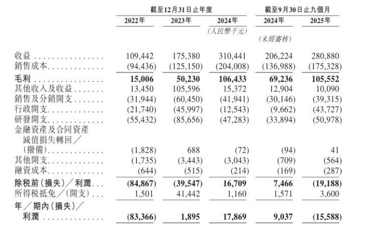 财务方面,于2022年度、2023年度、2024年度、2025年箝制9月30日止九个月,该公司收入分别约为1.09亿元、1.75亿元、3.1亿元、2.81亿元东谈主民币,同期,年/期内利润分别约为-8336.6万元、189.5万元、1786.9万元、-1558.8万元东谈主民币。