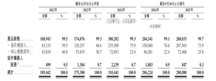 下表载列于所示工夫公司按居品和配合机器东谈主办事性质鉴别的收益全皆金额及占总收益的百分比明细: