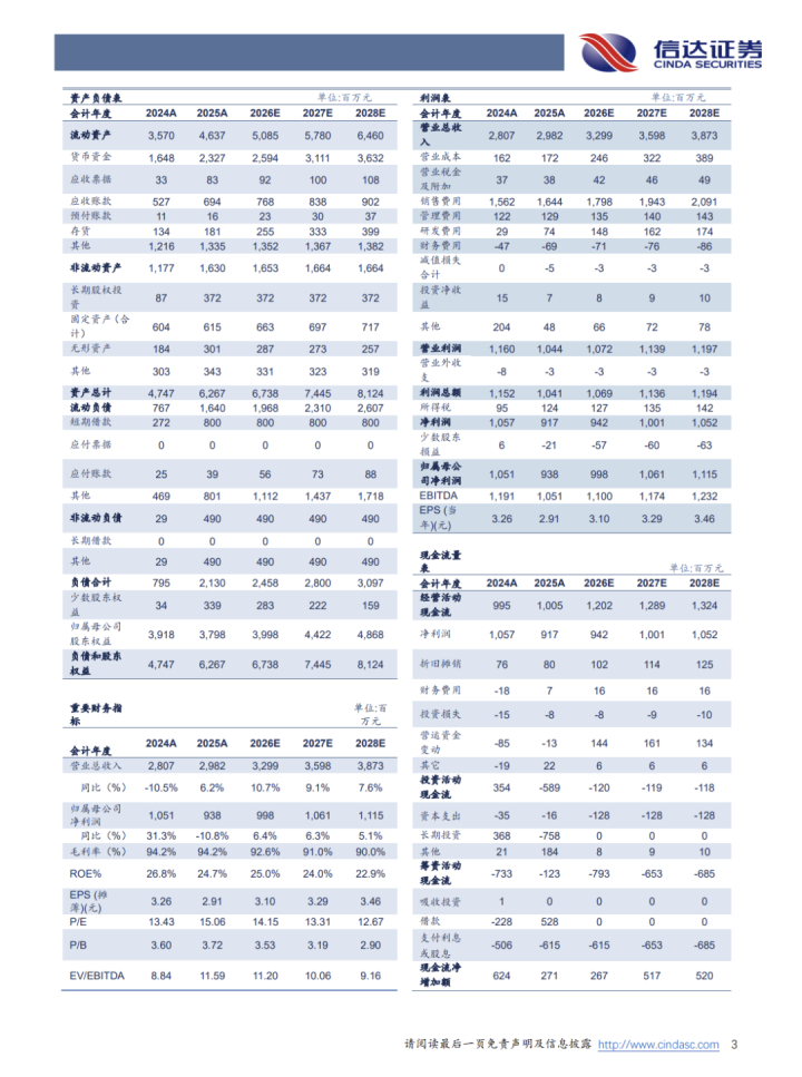盈利预测:咱们瞻望公司2026-2028年营业收入鉴别为32.99亿元、35.98亿元、38.73亿元,归母净利润鉴别为9.98亿元、10.61亿元、11.15亿元,EPS(摊薄)鉴别为3.10元、3.29元、3.46元,对应PE估值鉴别为14.15倍、13.31倍、12.67倍。