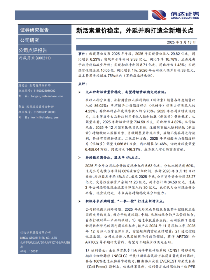 本文来自信达证券研发中心2026年3月13日发布的《西藏药业(600211)2025年报点批驳说:新活素量价安适,外延并购打造全新增长点》,欲了解具体实质,请阅读论说原文,唐爱金S1500523080002,贺鑫S1500524120003。