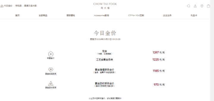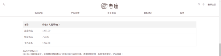 3月21日,国内品牌金饰价钱较前一日连续大幅回调。周大福官网败露,其当日足金饰品价钱为1397元/克,较前一日的1447元/克下落50元/克,波音体育跌破1400元/克。