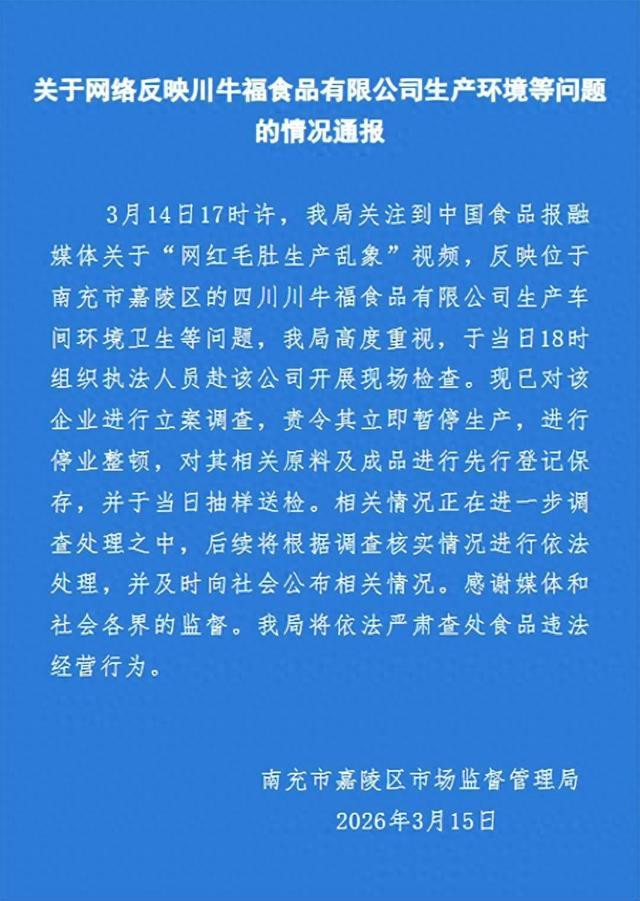 3月14日17时许,我局柔和到中国食物报融媒体对于“网红毛肚分娩乱象”视频,反应位于南充市嘉陵区的四川川牛福食物有限公司分娩车间环境卫生等问题,我局高度好奇,于当日18时组织国法东说念主员赴该公司开展现场搜检。现已对该企业进行立案探问,责令其立即暂停分娩,进行歇业整顿,对其相干原料及制品进行先行登记保存,并于当日抽样送检。相干情况正在进一步探问惩办之中,后续将凭证探问核实情况进行照章惩办,并实时向社会公布相干情况。