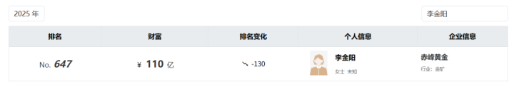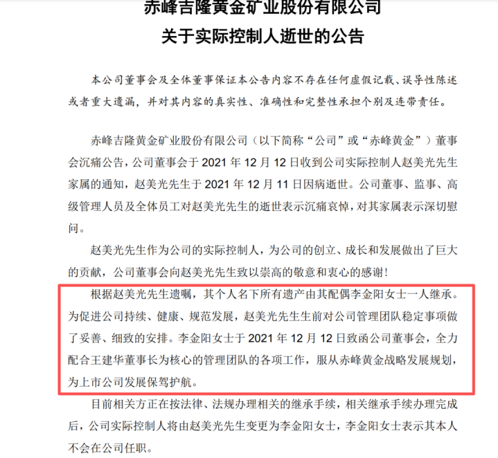 据媒体报说念,赤峰黄金由被誉为内蒙古四大富豪之一的赵好意思光于2005年创立,赵好意思光病逝后,浑家李金阳吸收了其个东说念主名下整个遗产,包括百亿市值的赤峰黄金。