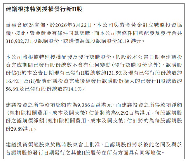 赤峰黄金早间公告,3月22日,公司控股鼓舞、本色胁制东说念主李金阳相称一致活动东说念主浙江瀚丰创业投资合股企业(有限合股)与紫金矿业集团股份有限公司全资子公司紫金黄金(集团)有限公司(简称“紫金黄金”)签署了《对于赤峰吉隆黄金矿业股份有限公司的股份转让条约》,李金阳相称一致活动东说念主拟将所抓忖度2.42亿股无穷售率领股沿途转让予紫金黄金;3月22日,经公司董事会批准,公司与紫金黄金签署了《政策投资条约》,公司拟以30.19港元/股的价钱向紫金黄金刊行3.11亿股H股庸俗股。
