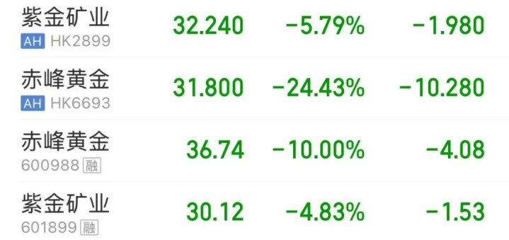 法例发稿,紫金矿业、赤峰黄金股价大跌,赤峰黄金A股跌停,港股跌超24%,紫金矿业港股跌超5%,A股跌超4%。