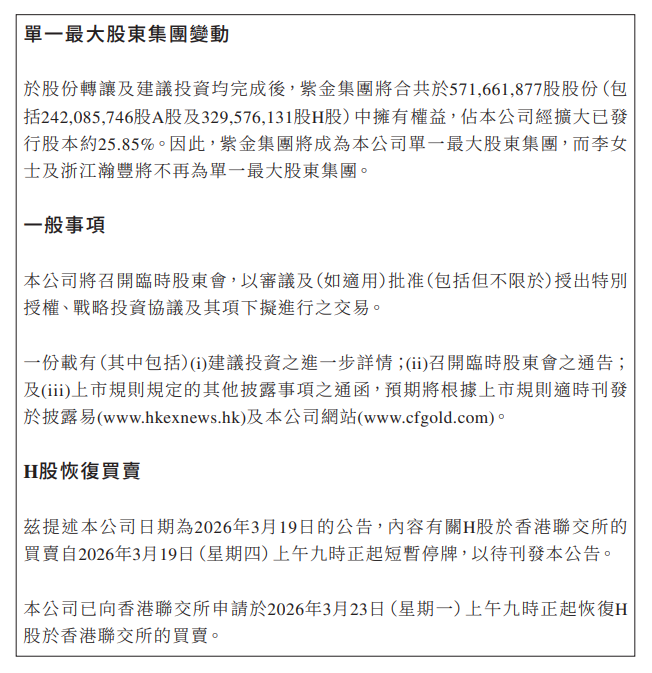 公司控股鼓舞将由李金阳变更为紫金黄金,公司本色胁制东说念主将由李金阳变更为上杭县财政局。经公司肯求,公司股票将于3月23日(星期一)开市起复牌。