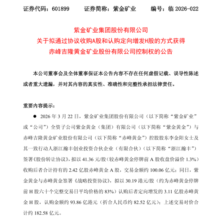 3月23日,紫金矿业(601899,股价31.65元,市值8415.7亿元)公告,3月22日,公司全资子公司紫金黄金与赤峰黄金控股鼓舞李金阳女士相称一致活动东说念主浙江瀚丰签署《股份转让条约》,拟以东说念主民币41.36元/股(较赤峰黄金停牌前A股收盘价溢价1.3%)收购后者忖度抓有的2.42亿股赤峰黄金A股,交游金额约东说念主民币100.06亿元;同日,紫金黄金与赤峰黄金签署《政策投资条约》,拟以30.19港元/股(约为赤峰黄金停牌前H股六十个圆善交游日平均价钱的83%)认购后者定向增发的3.11亿股赤峰黄金H股,认购金额约93.86亿港元(折合东说念主民币约82.52亿元);上述交游对价忖度约东说念主民币182.58亿元。