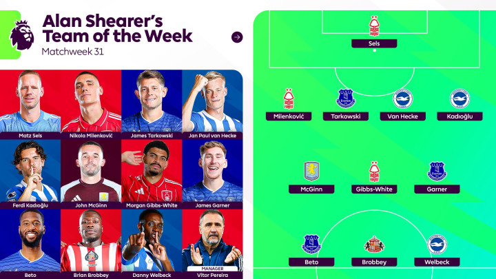 中场:麦金(阿斯顿维拉)、吉布斯-怀特(诺丁汉丛林)、詹姆斯-加纳(埃弗顿)